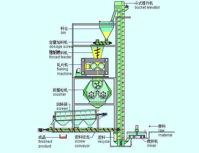 各种干粉物料从设备顶部加入,经脱气、螺旋预压进入两个平等轧辊,轧辊相对旋转,物料被强制送入两辊之间,轧辊将物料咬入辊隙进行强制压缩,物料通过压缩区后,物料的表面张力和重力使之自然脱出。脱出后的指条状团块进入碎粒机由旋转刀排破碎,被破碎的物料进入整粒机通过滚动刀排使颗粒和部分粉状物料进入旋振筛进行筛分。合格品通过输送机被送入成品仓。粉状筛下物料通过输送机再次被送回原料仓进行二次辊压,挤压力的大小可根据造粒操作的需要由液压系统进行调节。 通过改变辊面开槽形式,可得到片状、条状、扁球状等物料。